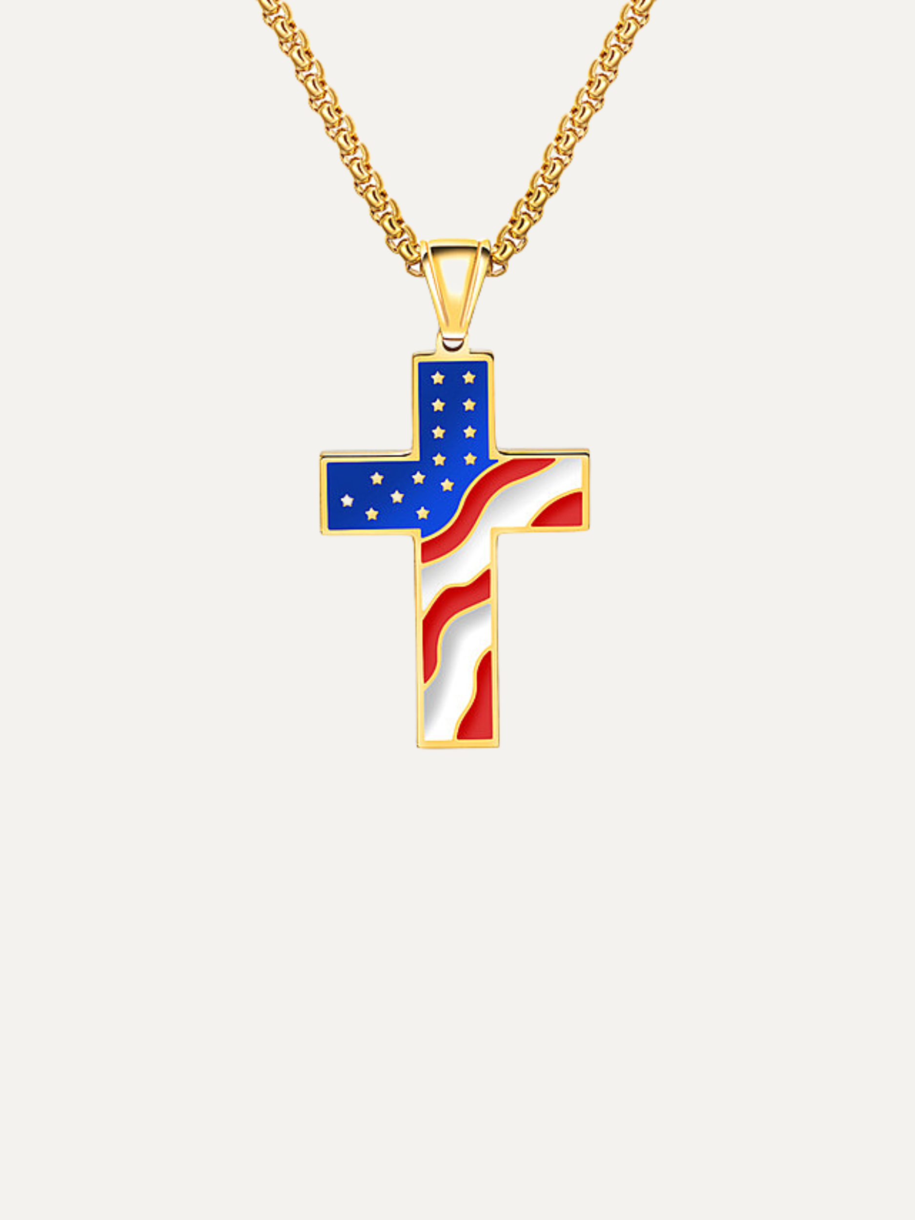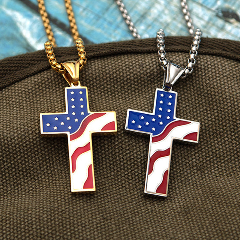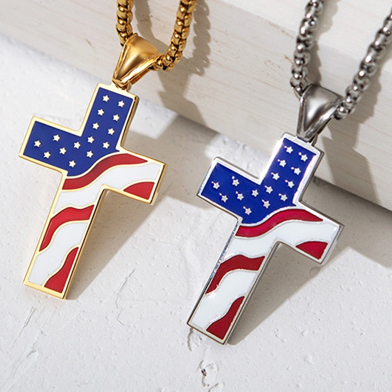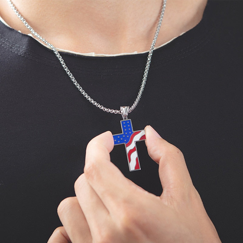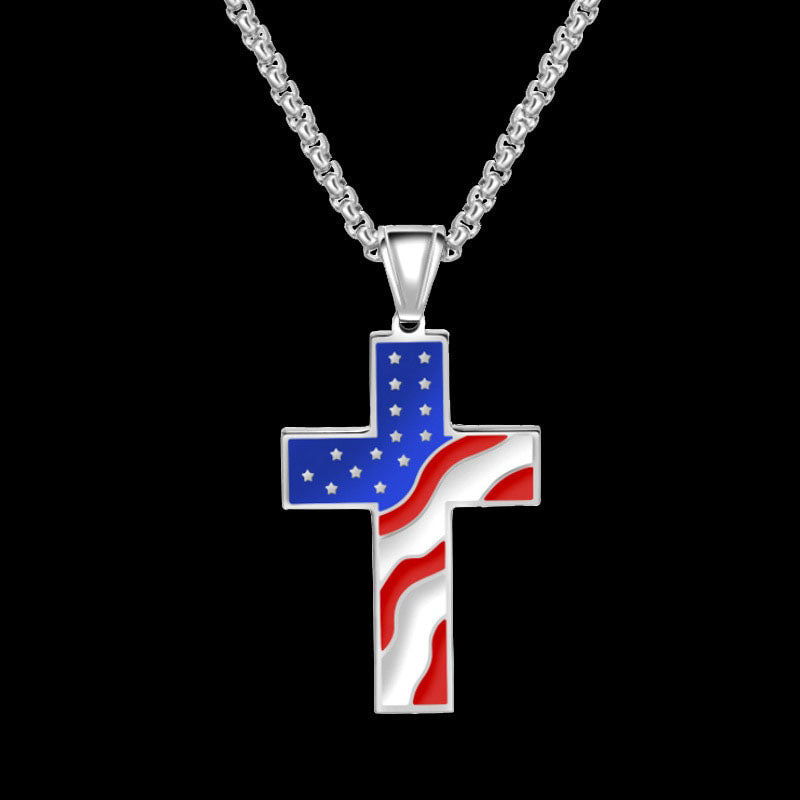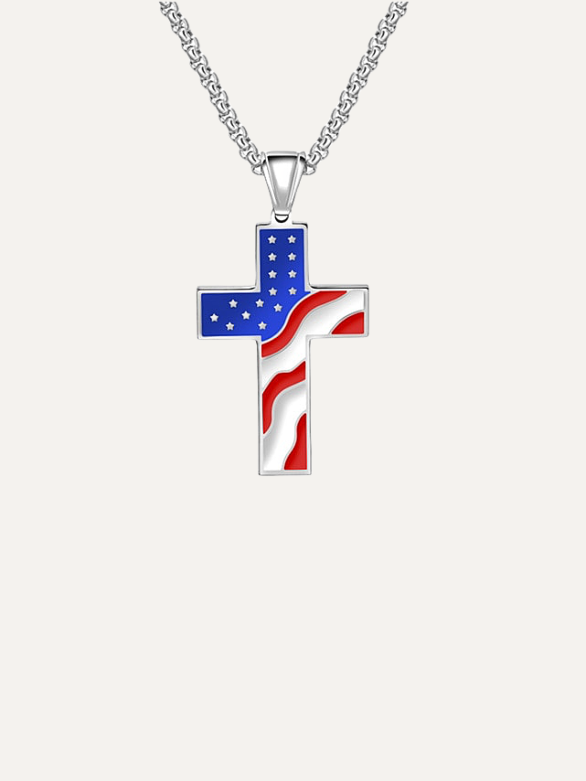 The pendant features a stainless steel cross, meticulously crafted and adorned with vibrant enamel detailing in the colors of the American flag. It beautifully showcases the blend of religious devotion and national pride.