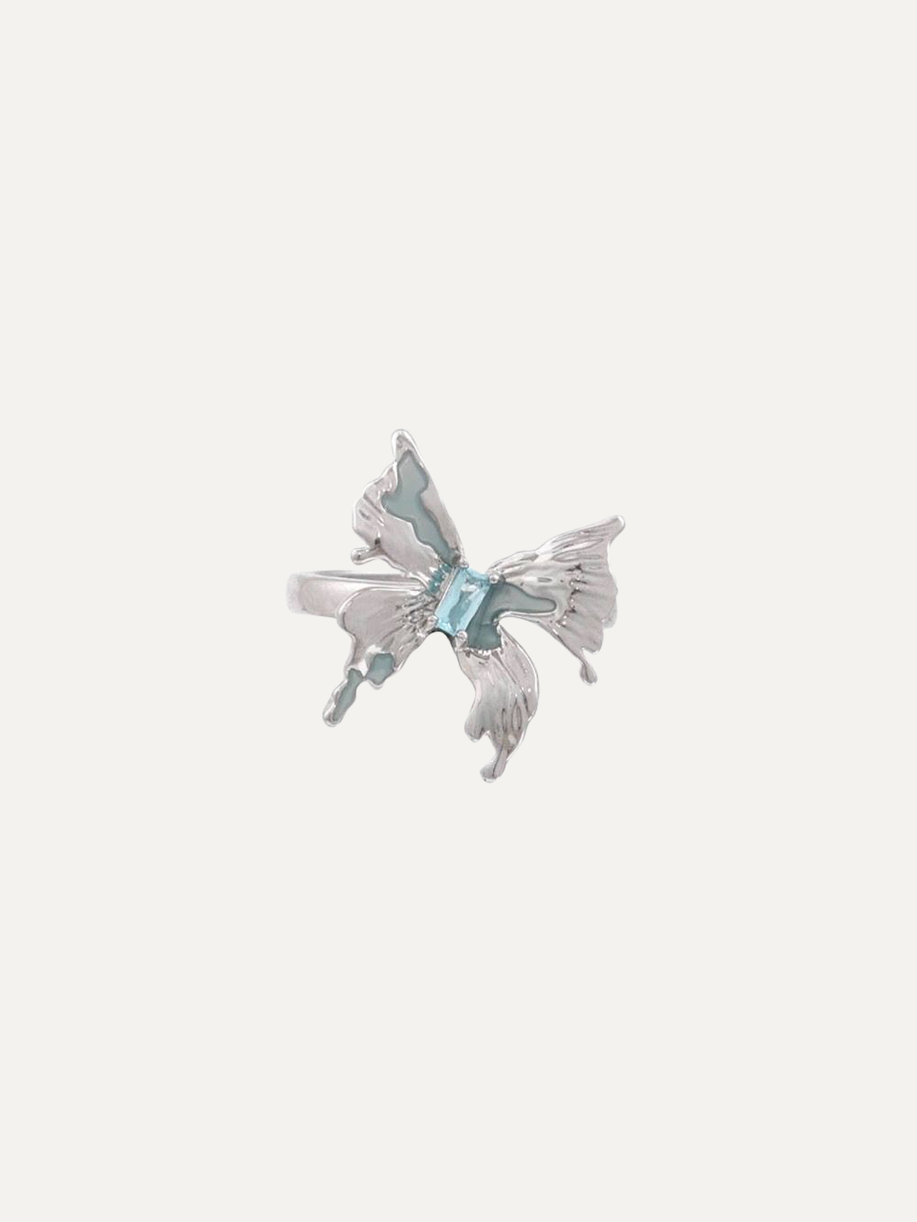 This ring features a clear blue butterfly motif, delicately crafted with intricate details that showcase the elegance of these delicate creatures.