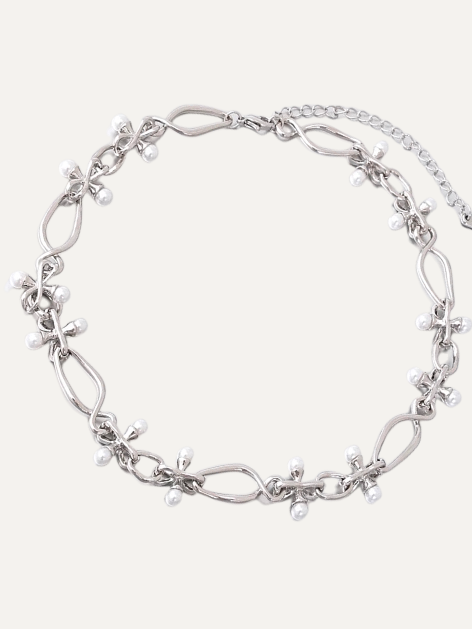 Accompanying the cross pendant are lustrous pearls, adding a touch of femininity and grace to the necklace. The pearls are carefully selected for their smooth texture and iridescent shine, enhancing the overall beauty of the piece.