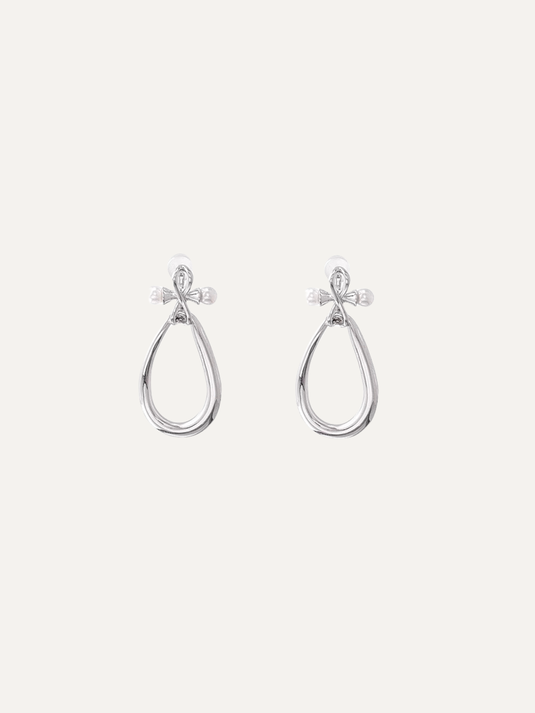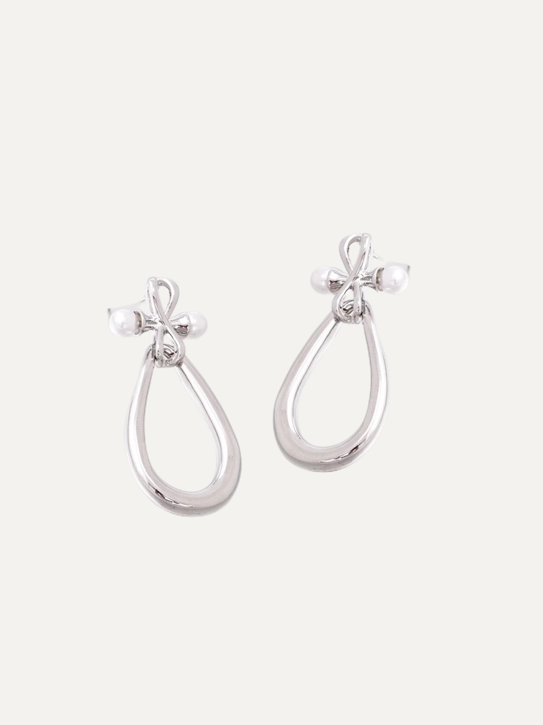 the earrings is adorned with lustrous pearls, creating a harmonious contrast between the sleek metal and the natural elegance of pearls.