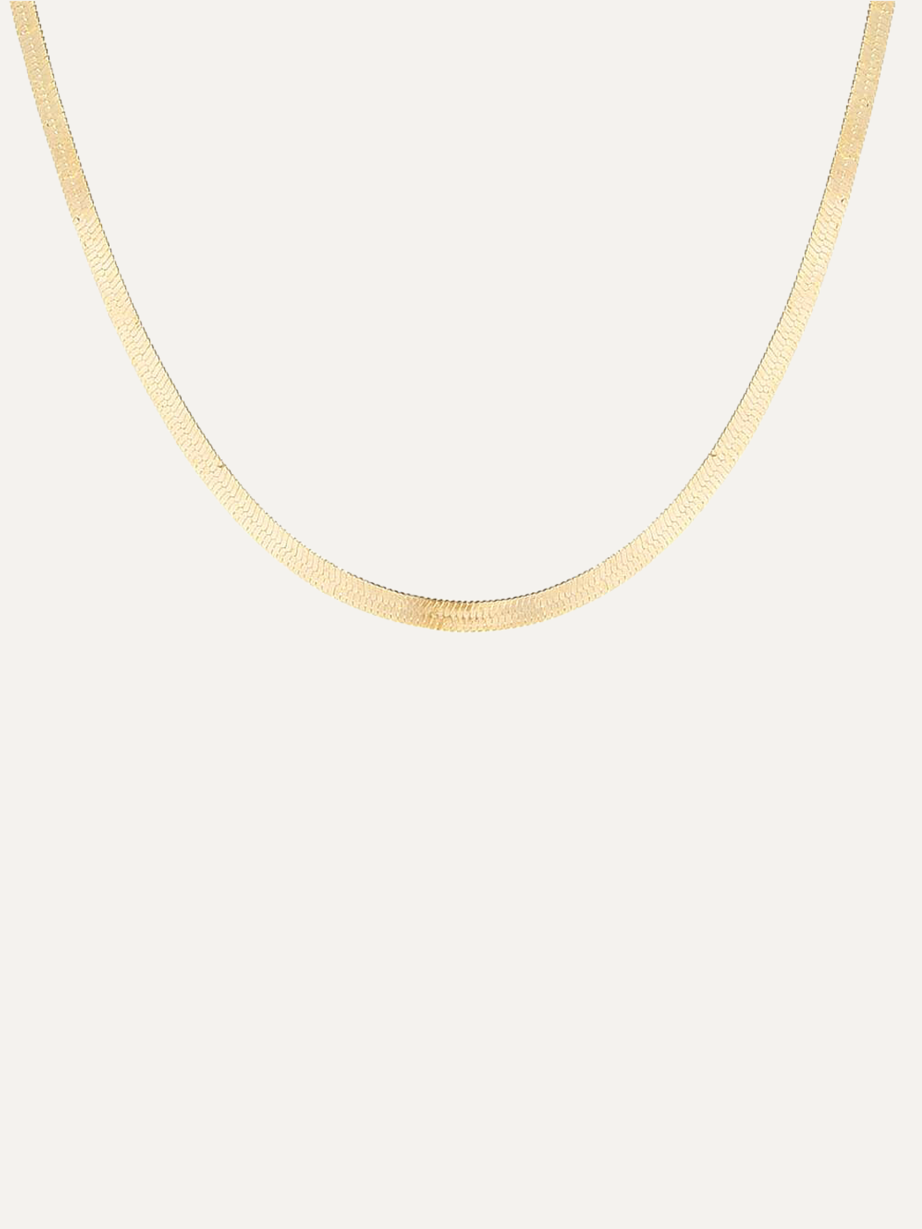 The choker necklace is crafted with a stunning gold blade chain, exuding a luxurious and edgy vibe. The flat snake chain beautifully drapes around the neck, creating a flattering and alluring look. Its sleek and minimalist design adds a touch of sophistication to any ensemble.
