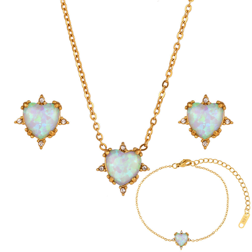 Gold Plated Heart Opal Pendant Necklace Earrings Stud Bracelet Set Gifts For Women