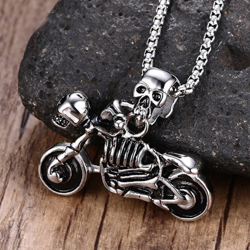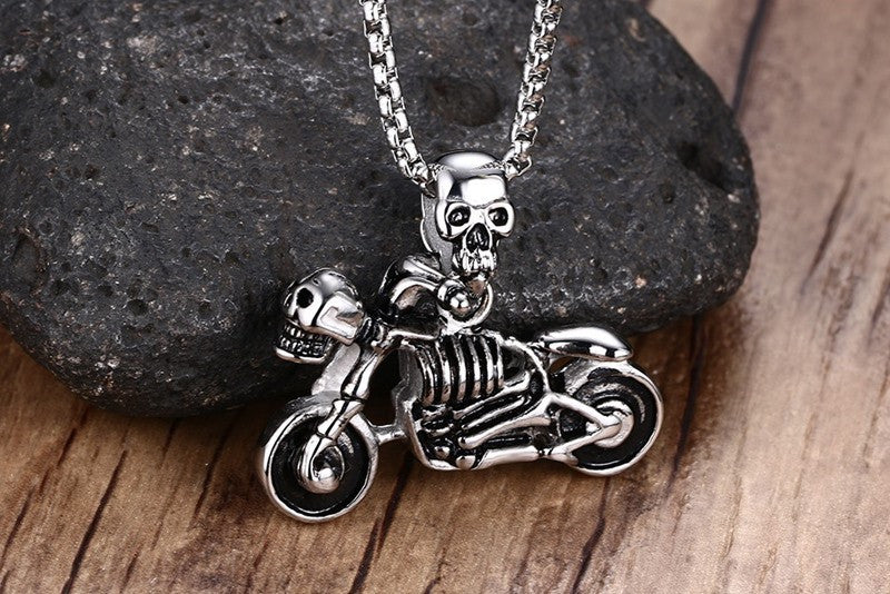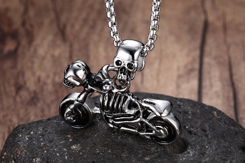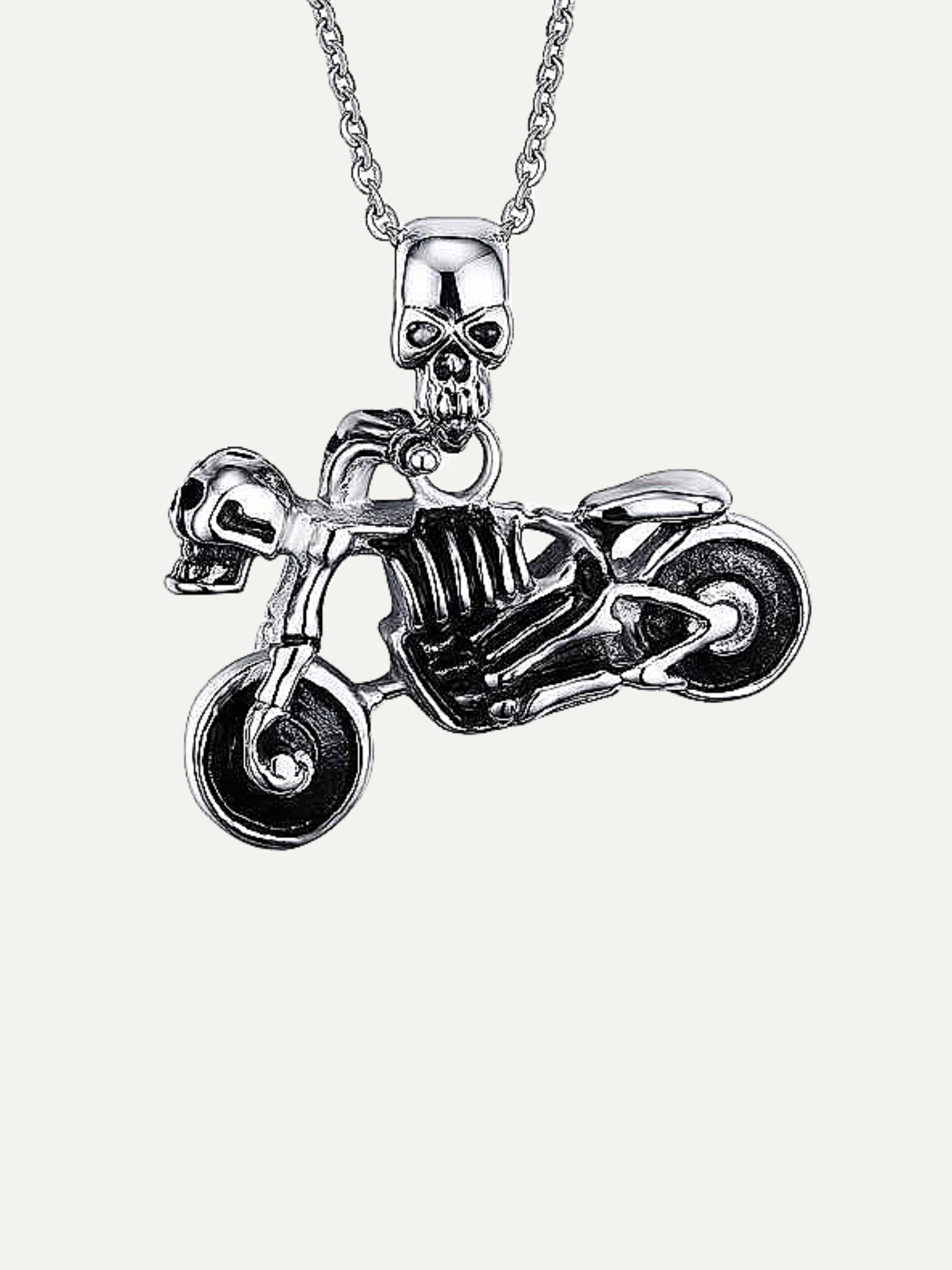 This necklace showcases a striking pendant in the shape of a gothic biker skull, meticulously crafted with intricate details. The skull's menacing expression, adorned with motorcycle-inspired elements such as gears, chains, and flames, symbolizes freedom, individuality, and a fearless attitude.