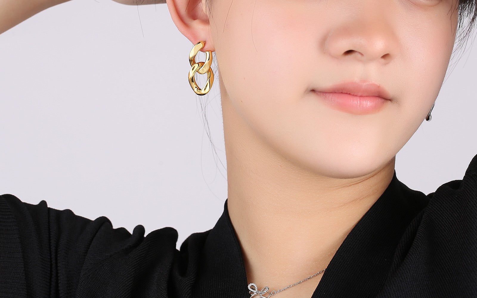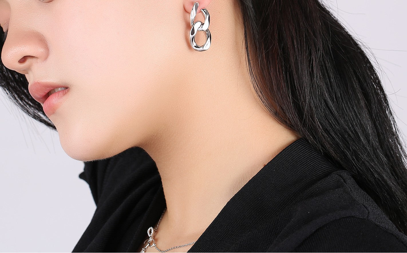 The metal chains dangle elegantly from the ears, creating a dynamic and captivating effect.