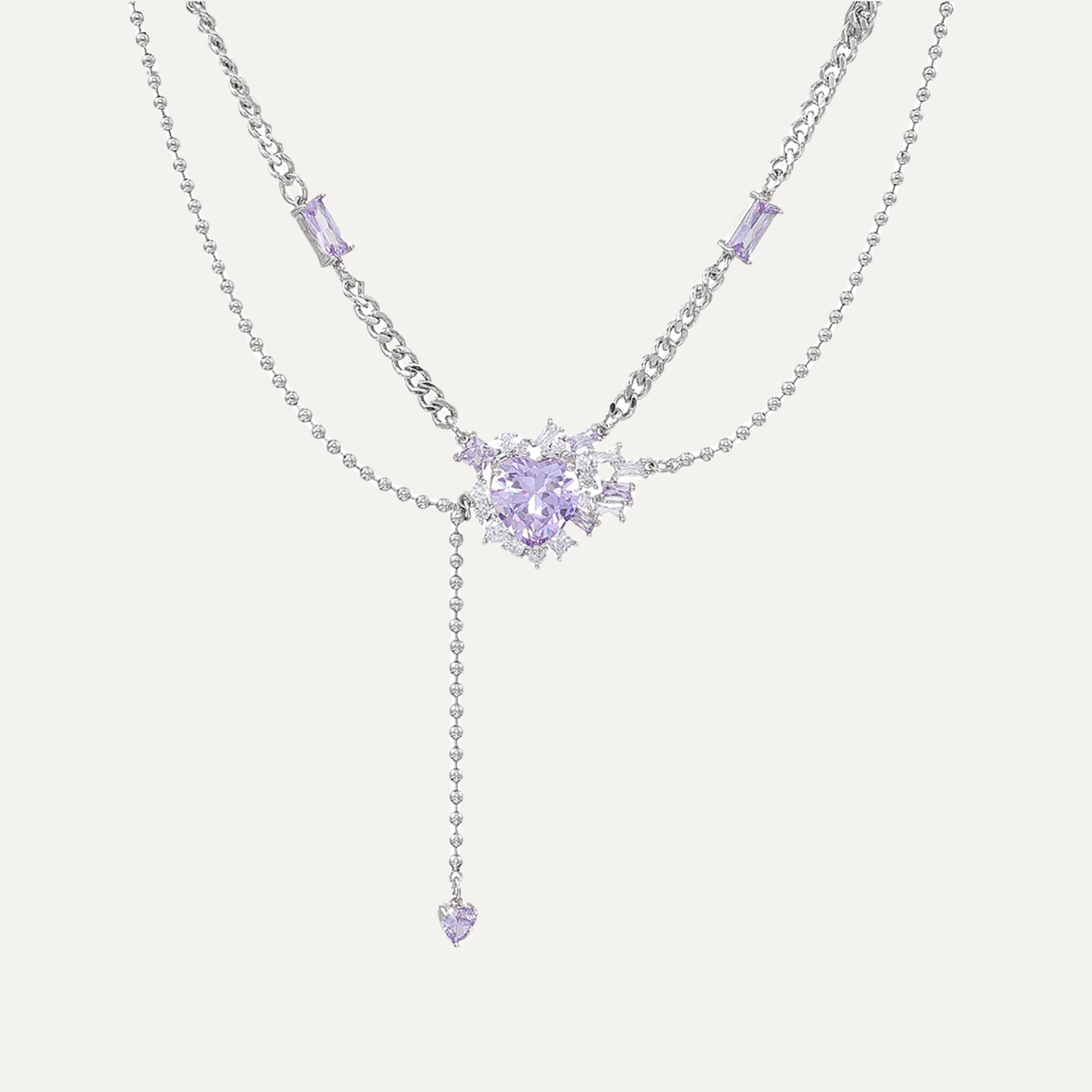 The combination of the multi-layered chains and the captivating purple gemstones creates a sense of movement and fluidity, enhancing the necklace's overall visual appeal.