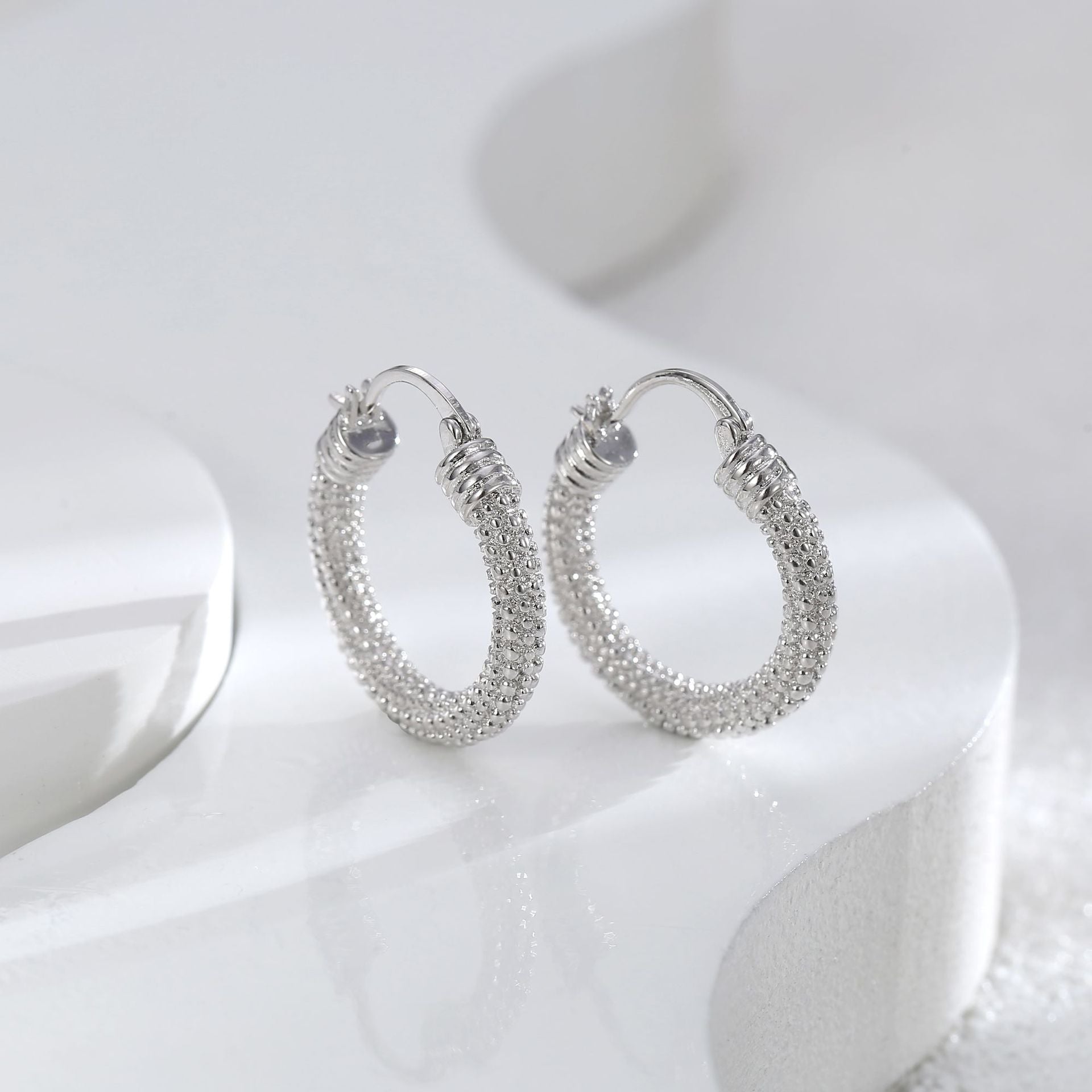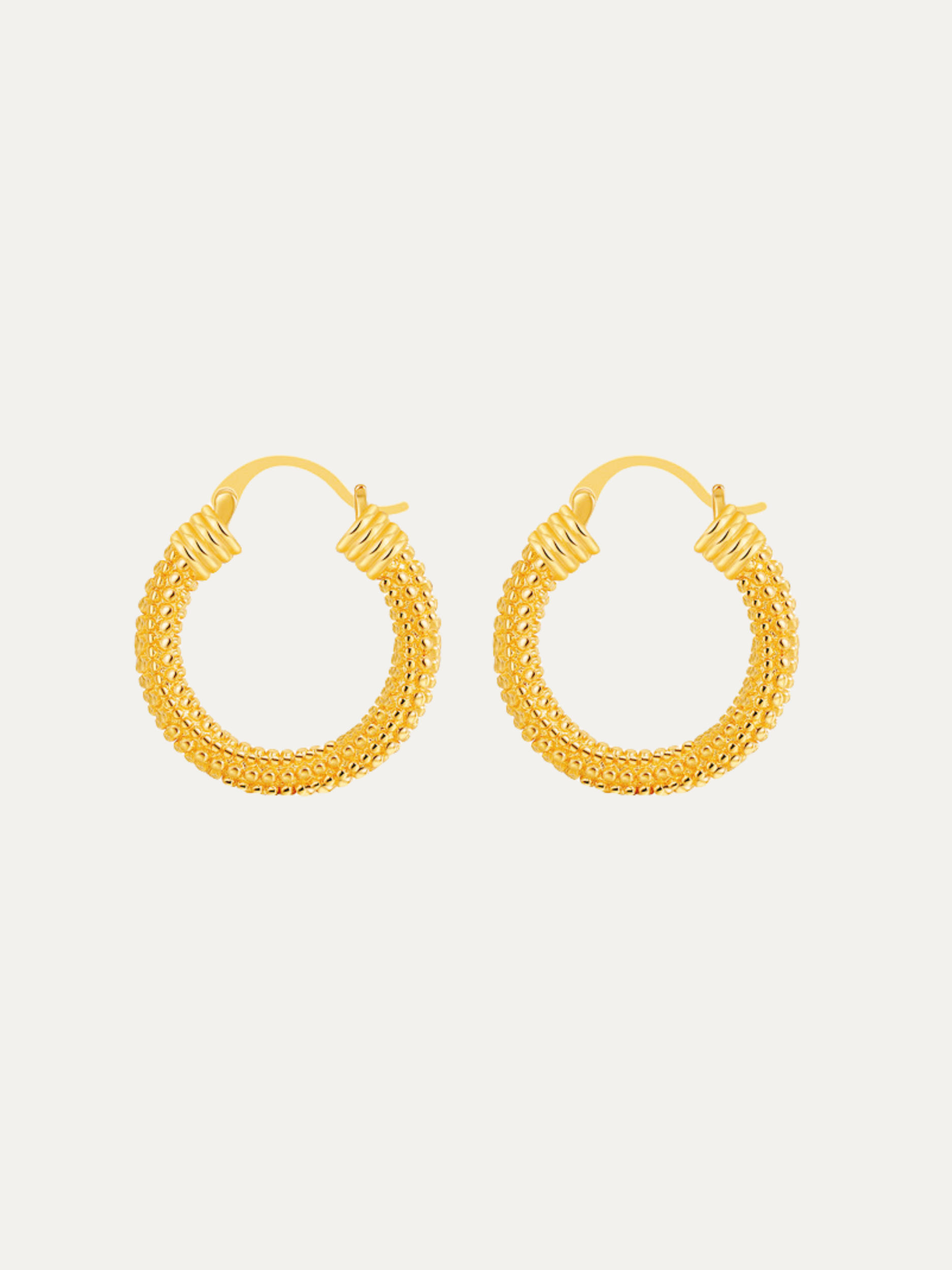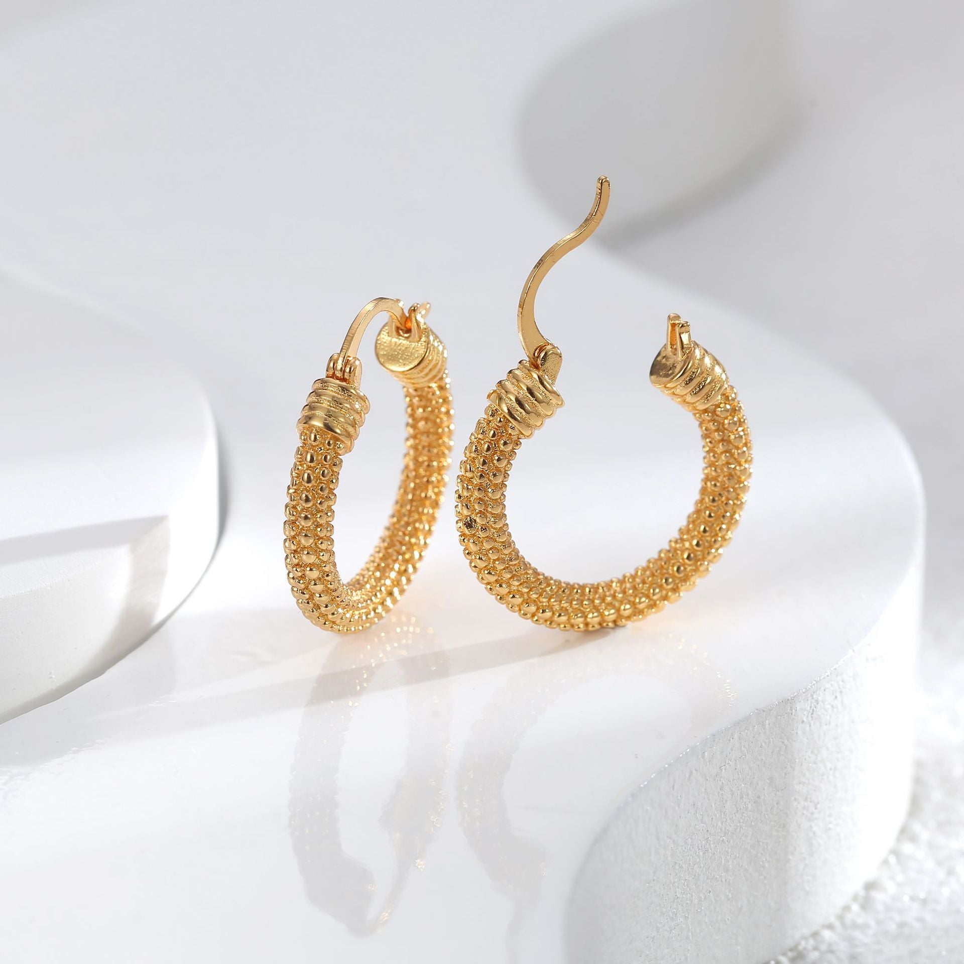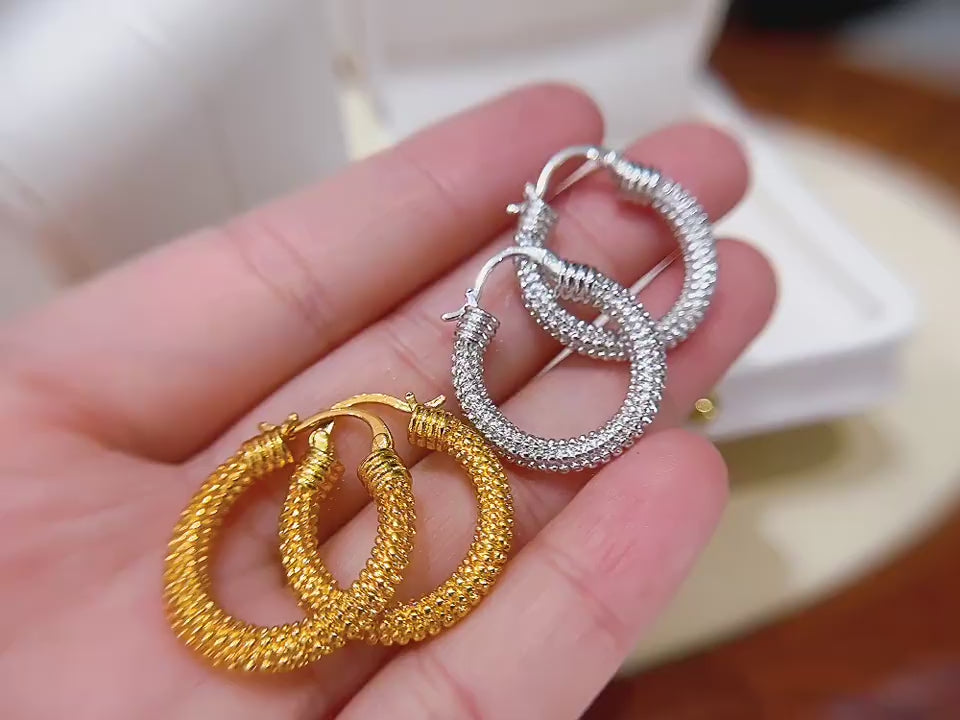 These earrings feature a circular hoop design with a rough, textured surface. The texture creates an interesting and eye-catching look that is both bold and sophisticated. The hoop shape of the earrings adds a classic touch to the design, making them a versatile accessory that can be dressed up or down.